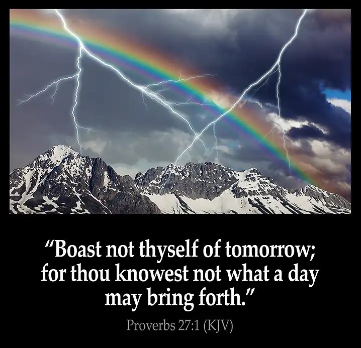 . Bible Verse March 1, 2025March 1, 2025 tolleystopicsLeave a comment Do not boast about what you will do tomorrow. You do not know what might happen. Share this: Click to print (Opens in new window) Print Click to email a link to a friend (Opens in new window) Email Click to share on Facebook (Opens in new window) Facebook Click to share on LinkedIn (Opens in new window) LinkedIn Click to share on Reddit (Opens in new window) Reddit Click to share on X (Opens in new window) X Click to share on Tumblr (Opens in new window) Tumblr Click to share on Pinterest (Opens in new window) Pinterest Click to share on Pocket (Opens in new window) Pocket Click to share on Telegram (Opens in new window) Telegram Click to share on WhatsApp (Opens in new window) WhatsApp Like Loading...
