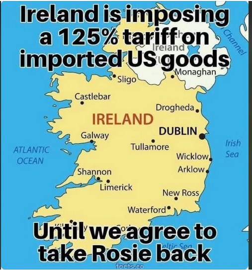 NO, NO, PLEASE NO…PLACE FOREVER TARIFFS ON MY FAVORITE IRISH WHISKEY. I WILL GLADLY PAY THE PRICE. BUT NEVER ALLOW THAT WOMAN TO BUY A TICKET TO AMERICA!